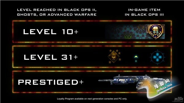 对于前作(《使命召唤11:高级战争》《使命召唤9:黑色行动2》《使命召唤10:幽灵》)玩家的奖励方案:
