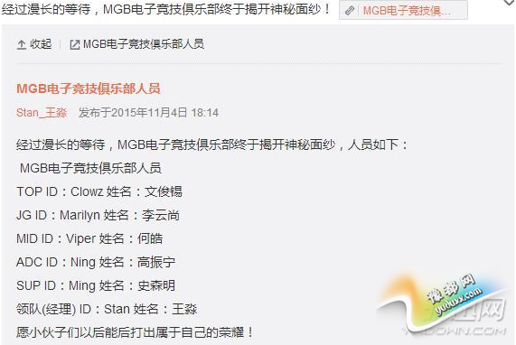 微博中,一名叫Stan_王淼的微博主备注是MGB电子竞技俱乐部领队,他发微博表示:筹备已久的MGB电子竞技俱乐部终于要揭开面纱了!