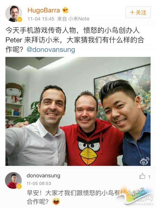 昨日,《愤怒的小鸟》创办人Peter来到小米公司,拜访了小米国际副总裁HugoBarra,宣布将有合作产品发布。