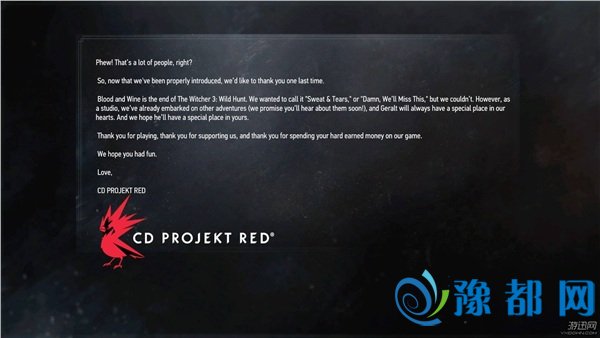 前几天,《巫师3:狂猎》最后一部DLC“血与酒”已经正式与玩家见面了,这也代表《巫师》三部曲系列游戏正式完结。为了感谢玩家对这款游戏的支持,开发商CD Projekt Red特地写了一封感谢信,一起来看看。