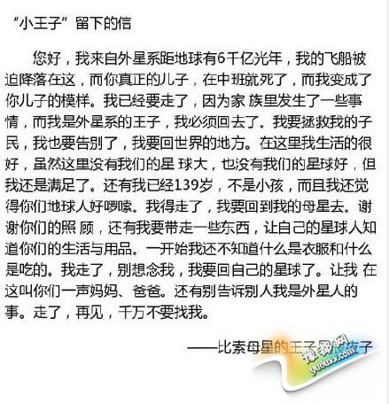 “您好,我来自外星系,距地球有6千亿光年,我的飞船被迫降落在这,而你真正的儿子,在中班就死了。”书信中,小志自称“比索母星球的王子星辰夜子”,已经有139岁,不是小孩。“因为家族发生了一些事情”,自己必须回去“拯救我的子民”。书信中,小志表现出矛盾的情感,一会提到“你们地球人好啰嗦”,一会又称“感谢爸爸妈妈的照顾”。