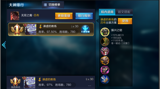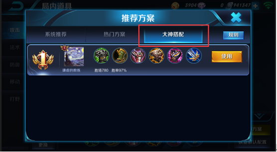 在大神排行中查看大神信息时,可直接将大神的出装方案使用到自己的局内装备方案中。同时在局内装备配置界面,也新增了大神出装方案,并支持便捷的套用大神方案,离大神更近一步了有木有!