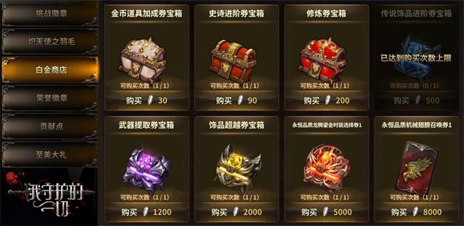 此外,白金商店再度开放,各种稀有装备不再是梦想!在新版本中,玩家可通过充值得到海量白金点数,即可在白金商店内购买到独有的珍贵装备与物品!值得一提的是,购买了成长基金的玩家将在这次活动中返赠相应的白金点,白金点可兑换永恒品质机械翅膀、永恒品质龙腾鎏金时装等高价值道具!