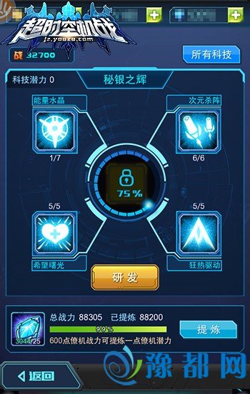 战队等级达到35级后,点击僚机面板右下角的“僚机科技”按钮,就可以看到僚机科技面板,在下方有一个进度条,点击“提炼”按钮,每600点僚机战力可提炼一点僚机潜力,提炼的时候还会消耗少量合晶。