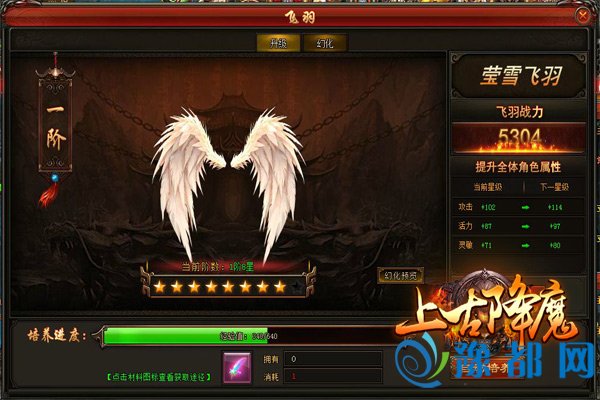 游戏中,玩家通过消耗七彩凤羽来对飞羽进行培养,每次培养将随机增加飞羽的培养值,培养值满则飞羽将自动升星升阶,每个等阶共分9星。当飞羽到达9星时,需消耗羽灵石进行升阶,玩家无须担心遭遇大多数页游中祝福值清零的情况。只要玩家有材料进行培养,无论成功与否,都将保留培养后的培养值,方便玩家在任意时间强化自己的飞羽。同时,消耗的七彩凤羽可在副本诅咒之塔获得,或使用闯关对战中积累起的声望进行购买,而羽灵石可通过副本闯关和声望购买获得。