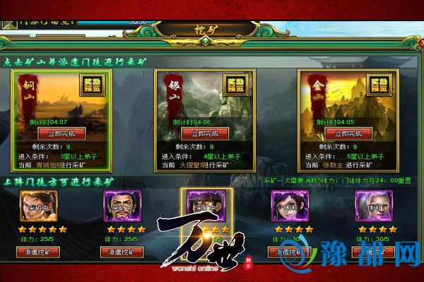 身为一名盖世豪侠,理应像张三丰一样成为一代宗师,武林界的泰山北斗。玩家可以在游戏中,自立帮派,开启门徒系统,广纳天下豪杰义士。门徒可以定期免费招募,也可通过消耗招募道具或者元宝进行招募。富含着大量银两的金矿、银矿和铜矿,都是你累计财富的绝好宝藏,如果运球不错的话,还能挖掘到珍贵的门徒武器,使你的门徒具有更强大的战力。