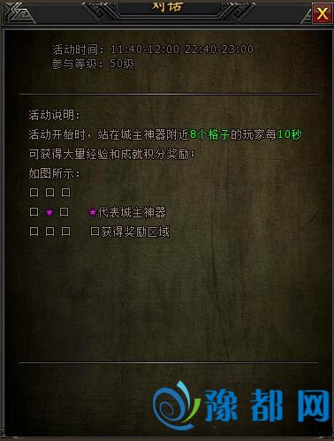 每日11:40—12:0和22:40—23:00为活动时间,活动开启,只要站在城主神器周围8格范围之内,就可以获得大量经验和成就几分等奖励。