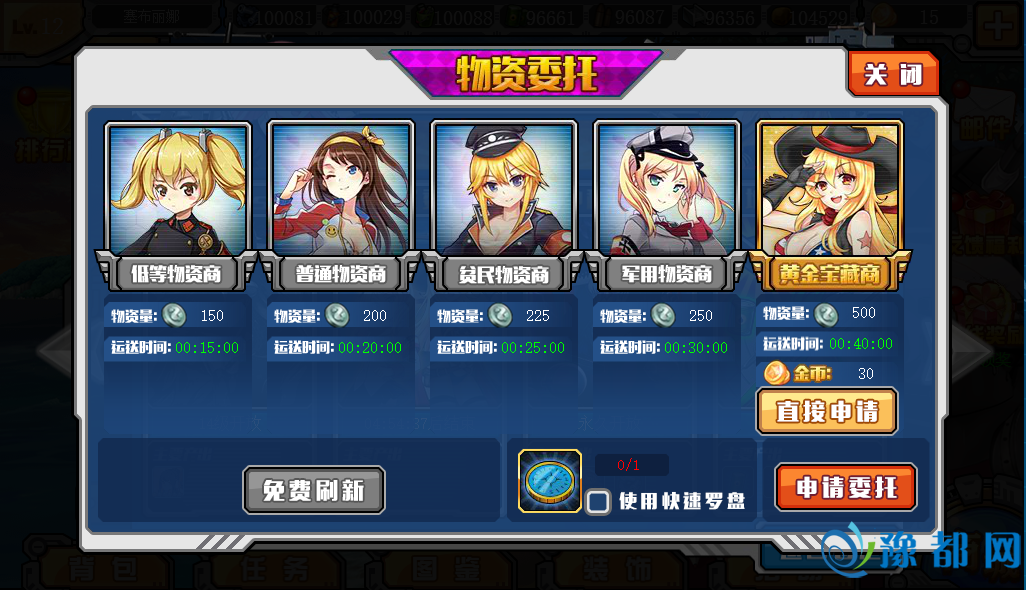 选择一个舰队押送物资,运送完成后将会获得物资币(物资币在物资商店兑换道具,装备等),一共有5个委托商,不同的委托商给予的物资币不同,在押送的过程中,会被人劫取。