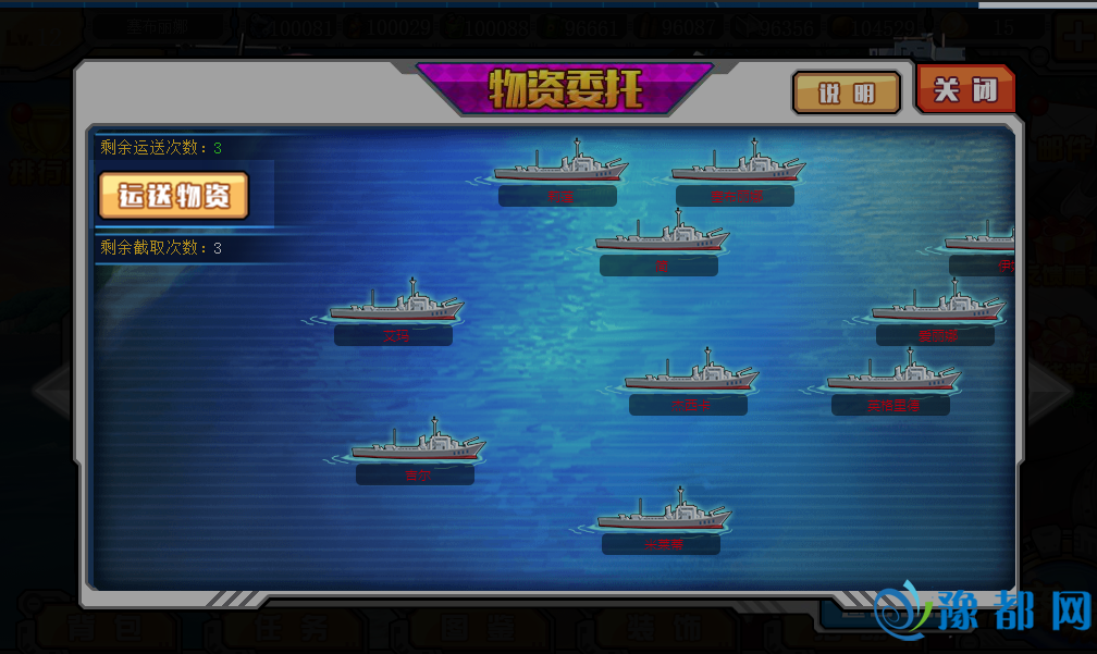 1. 页面讲解:该系统中分运送物资,截取物资(点击敌方船就可以进行截取),功能说明,直接申请。申请委托,使用快捷罗盘,物资商店,以及委托刷新。