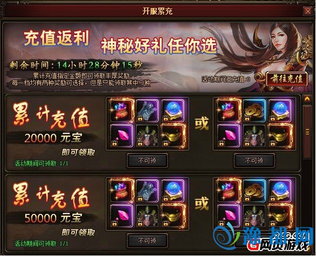 累计充值20000元宝可以获得经验丹,金币,绑定元宝等奖励。其他奖励要做出选择,是选择提升官职和坐骑,还是选择提升转生等级和闪避。小编建议大R选择左边的,毕竟闪避和转生等级要好弄一点!