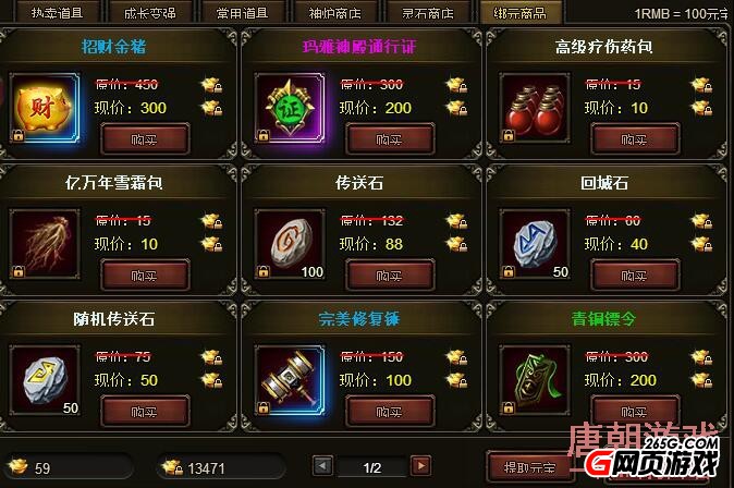 绑元可以购买药水和传送石,这些都是实用的道具。除此之外还可以购买招财金猪,使用招财金猪可以获得铜钱。玛雅神殿通行证是玛雅神殿的门票,完美修复锤是用来修复装备耐久的!