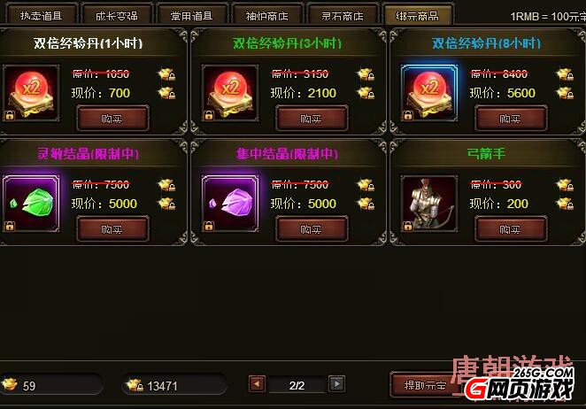 除此之外绑元还可以购买双倍经验丹,建议合成4倍经验丹使用。除此之外,灵敏结晶可以提升闪避,集中结晶可以提升命中,而弓箭手则是塔防副本道具,打塔防副本的时候必备道具。
