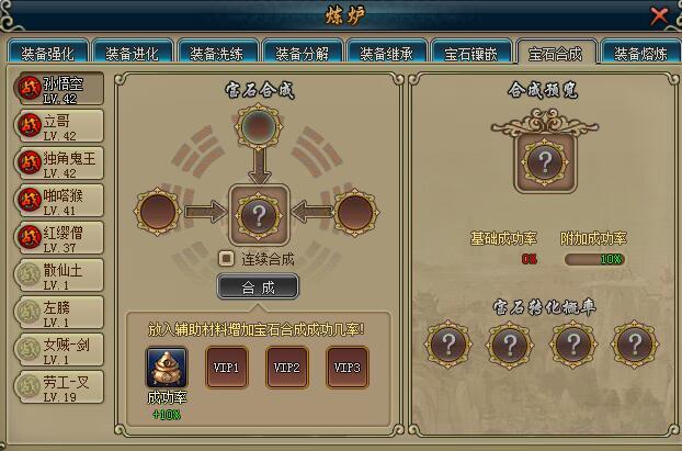 宝石合成功能在宝石镶嵌功能之后,玩家只要在宝石位放慢相同的宝石就可合成了,若是宝石足够,也可在连续合成处打钩,这样就可以多次合成了。原有宝石通过合成,器强力也会得到提升。当然,合成必定存在着风险,要知道,宝石合成有一个基本的成功率,但也有附加成功率。