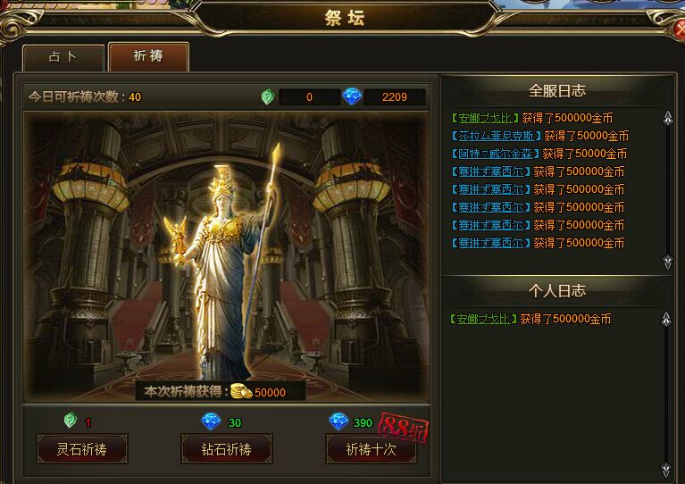 分为灵石祈祷和钻石祈祷,每次祈祷可获得5W钱币,大R玩家可以直接通过钻石祈祷获得大量钱币。