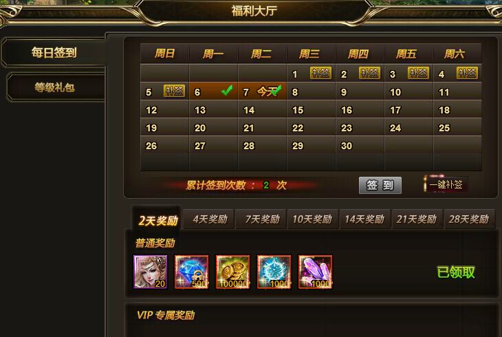 每日签到累计2天,4天,7天,14天,21天,28天都可以获得丰厚的奖励和大量钱币,VIP玩家更有额外奖励获得。