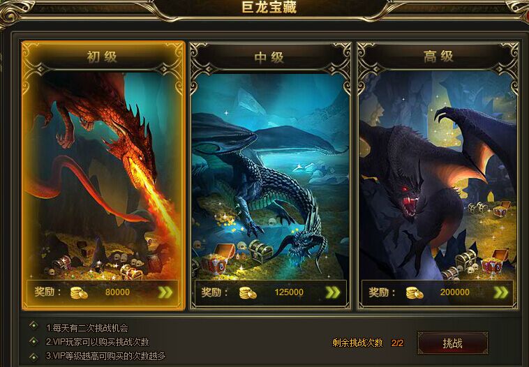 分为初级,中级,高级,每天有2次挑战机会,VIP玩家可以购买挑战次数。