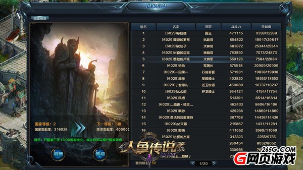 在这个板块中,可以看到全服所有玩家的信息,也可以进行捐赠和领取俸禄。捐赠分为两种,蓝钻捐赠和金币捐赠,随着捐赠次数的增加,对于消耗的需求也就越高。捐赠完成后,会提升国家贡献度,贡献度居于排名前列的玩家,可以根据排名的顺序获得不同官职的竞选资格。官职竞选每小时更新一次,无需手动报名,系统自动更新。已消耗的贡献度不会影响该竞选排名。每3天竞选一次,根据竞选官职将正式在国家官职中展示,官职分为5个品级,贡献度越高品级就越高,任何玩家都有可能成为下一任领导者。