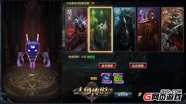 每个国家都有居心叵测的坏人,在《人鱼传说》中也不例外。当角色等级达到80级后会开启国家通缉,进入系统,会看到简单、普通、困难、史诗、神话五种不同阶段的通缉任务,
