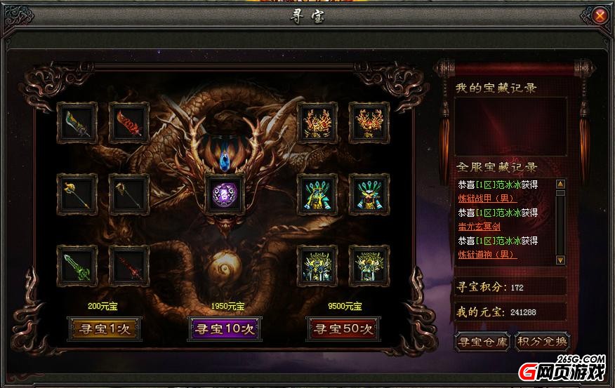 当玩家打开面板后,玩家通过使用宝藏钥匙和元宝进行寻宝