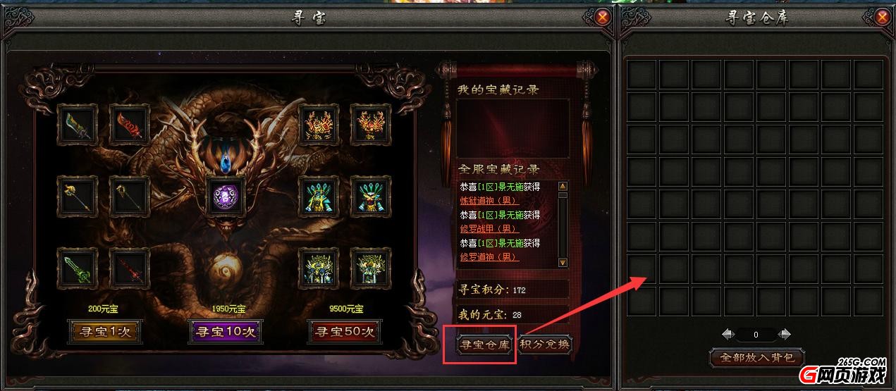 玩家点击宝藏寻宝仓库按钮便可打开仓库面板。