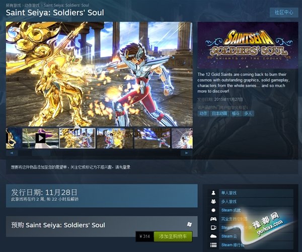 由万代南梦宫开发的《圣斗士星矢:斗士之魂》正式宣布将于11月28日面向PC发售,目前该游戏已经登陆Steam开启预售,国区售价高达314元!