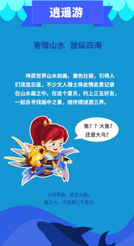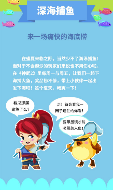 是正义无私的官兵呢?在暑期里,当然少不了捕鱼了,《神武2》每周一和周五让玩家们不会游泳也照样捕到大鱼,简单易懂轻松上手捕大鱼!每周四的逍遥游
