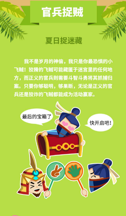 同力抗蛮族,保卫长安!官兵抓贼则带给我们满满的童趣感,让我们在线上回味这快乐的游戏,但同时也是考验玩家智慧的哦!你是化身机灵滑头的小偷呢?还