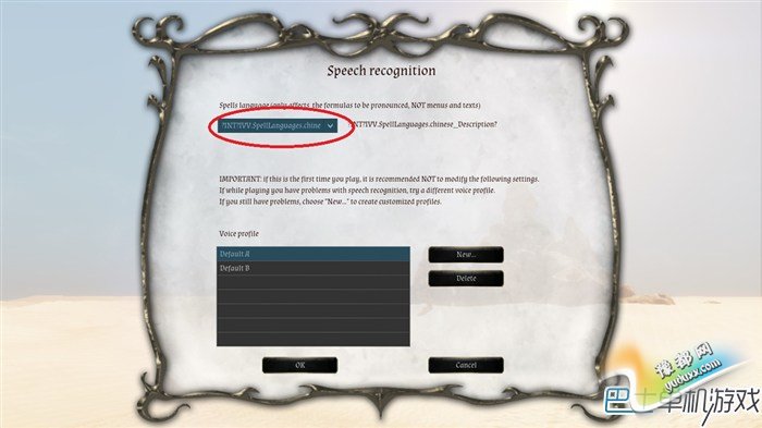 然后进入游戏,在语音识别【Speech Recognition】-魔法语言【Spells Language】,选择一堆乱码的条目。